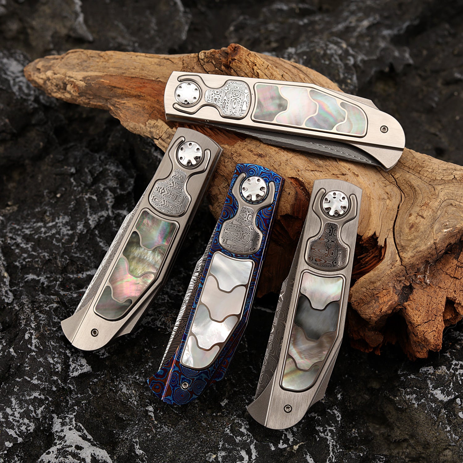 This custom folding knife is a compact beauty. Damasteel® clip point powder Damascus blade delivers exceptional sharpness and durability, while the button Lock ensures smooth use and ridiculously fast action. The titanium frame handle, beautifully inlaid with lip pearl and Swedish powder Damascus steel, offers a unique and sophisticated grip. Elevate your collection or everyday carry with a knife that combines unmatched craftsmanship and striking design.