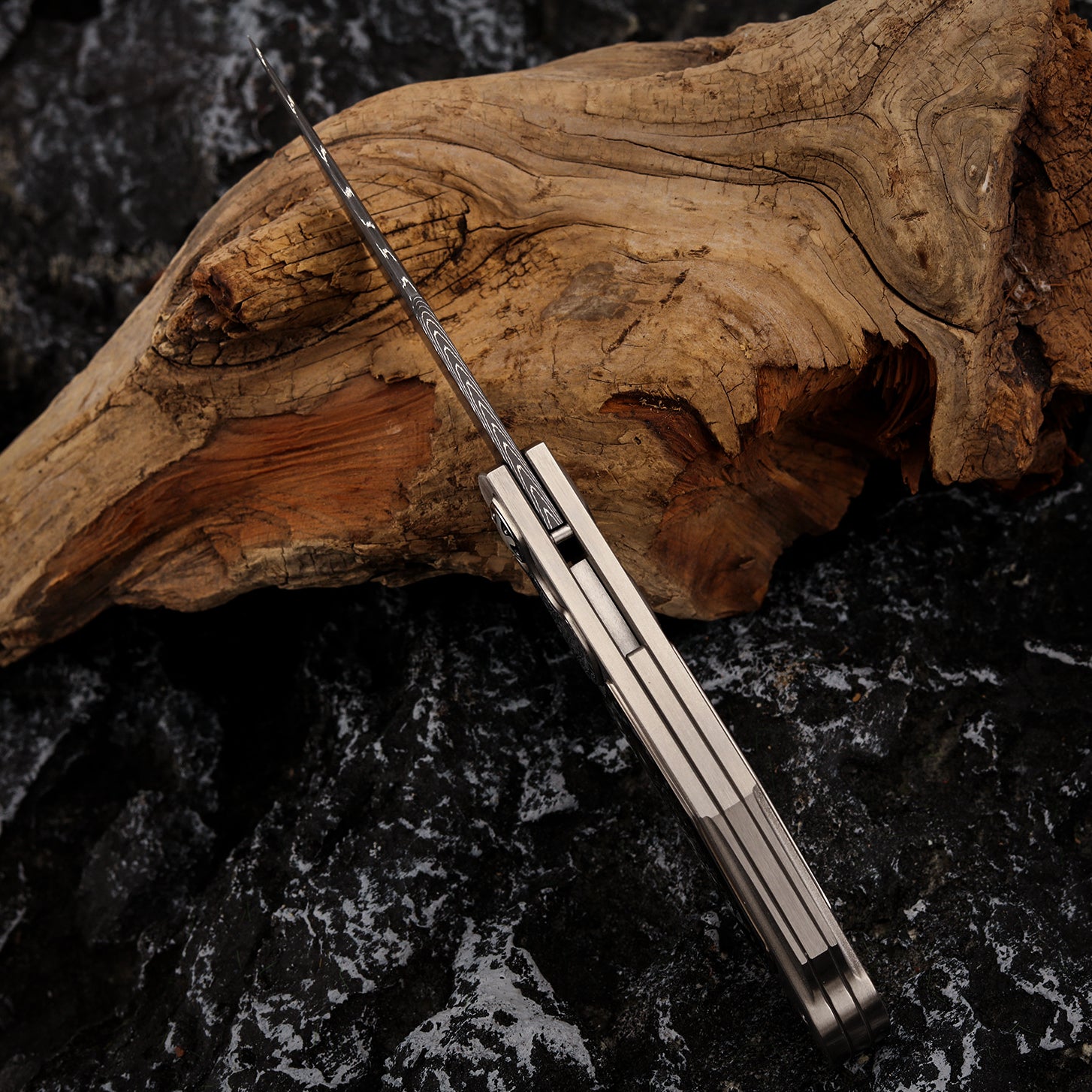 Handle Material: Titanium/Timascus frame inlay with lip pearl and Swedish powder Damascus steel