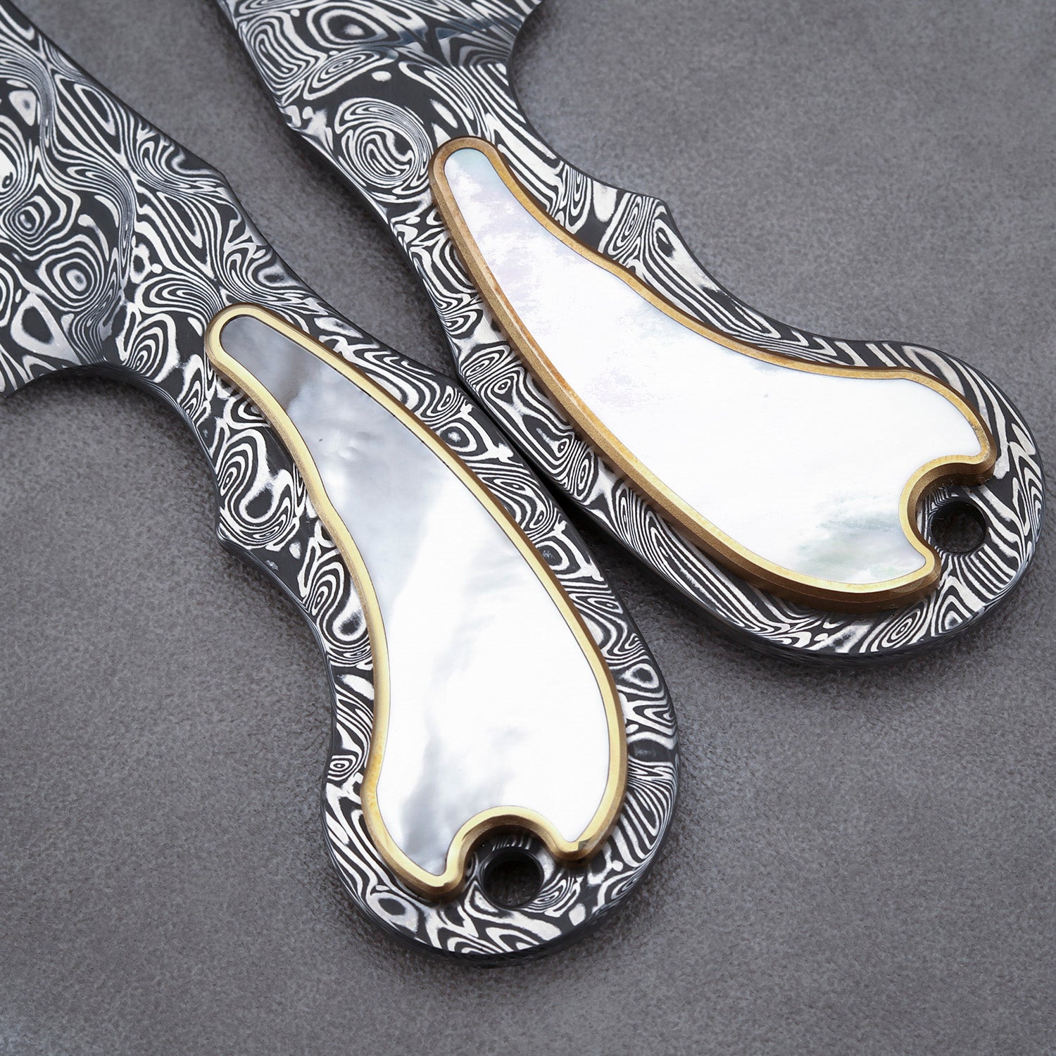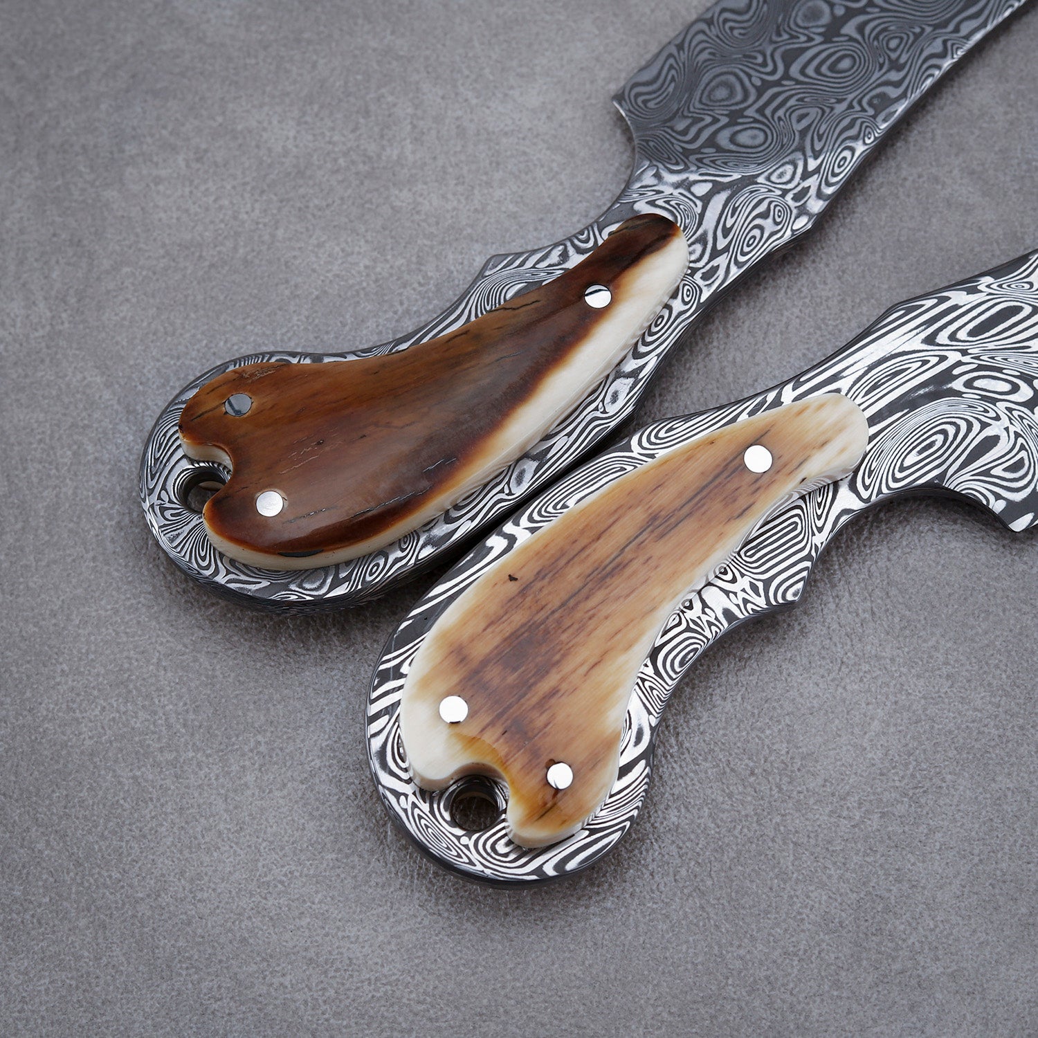 This mini neck knife features a blade forged from Swedish Powder Damascus steel, known for its durability and striking patterns. The handle is crafted from either lip pearl or mammoth tusks, adding a touch of elegance and uniqueness. Perfectly sized for everyday carry and collection, this finely crafted knife blends functionality with sophisticated design, making it an exceptional accessory for both practical use and display.