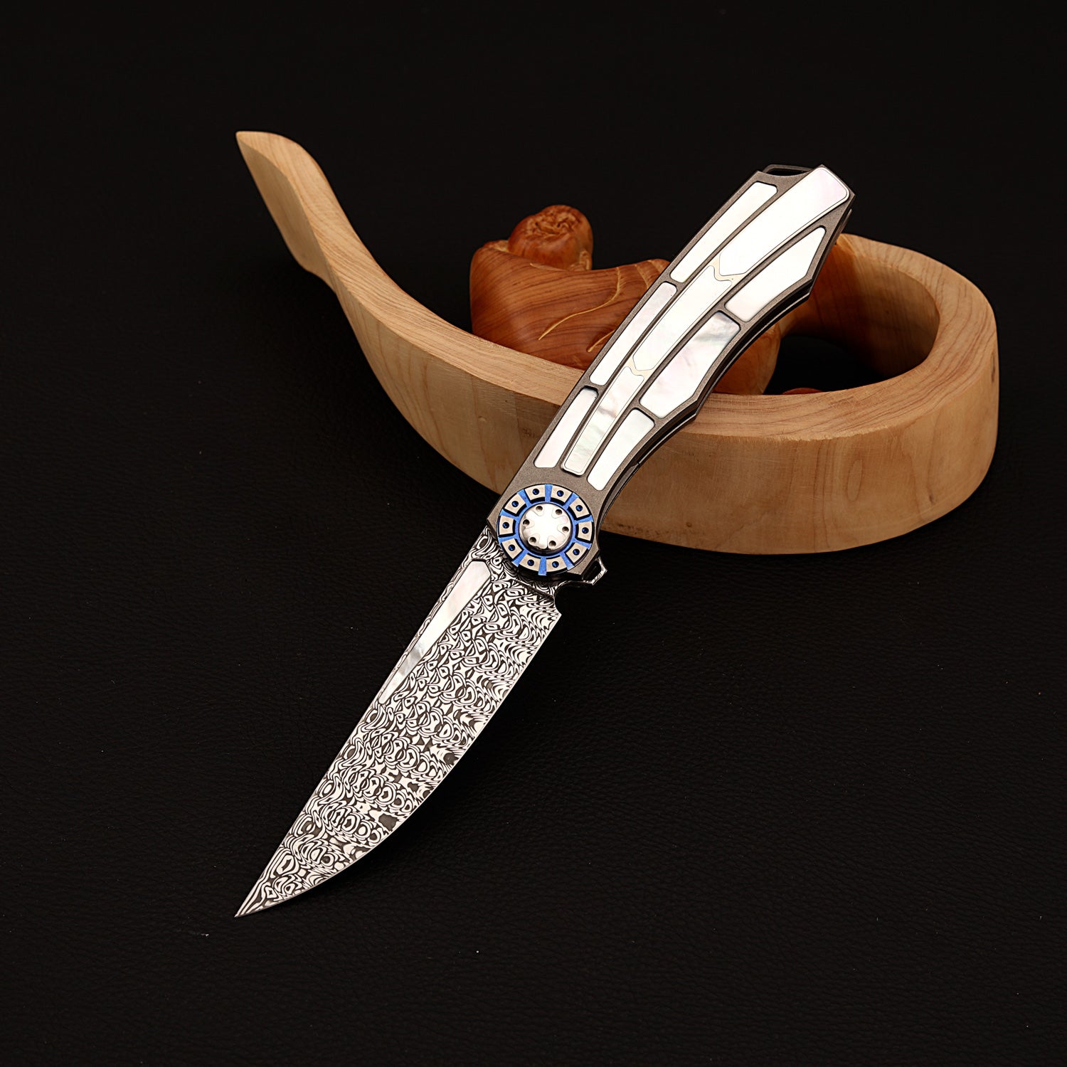 This exquisite custom liner-lock knife features a hand-forged Damascus steel blade complemented by a lip pearl inlaid thumb groove. Its titanium frame handle is artfully inlaid with lip pearl and timascus, blending strength with elegant design. The reliable liner lock mechanism ensures smooth, one-handed operation. Ideal for everyday carry or as a refined addition to any collection.