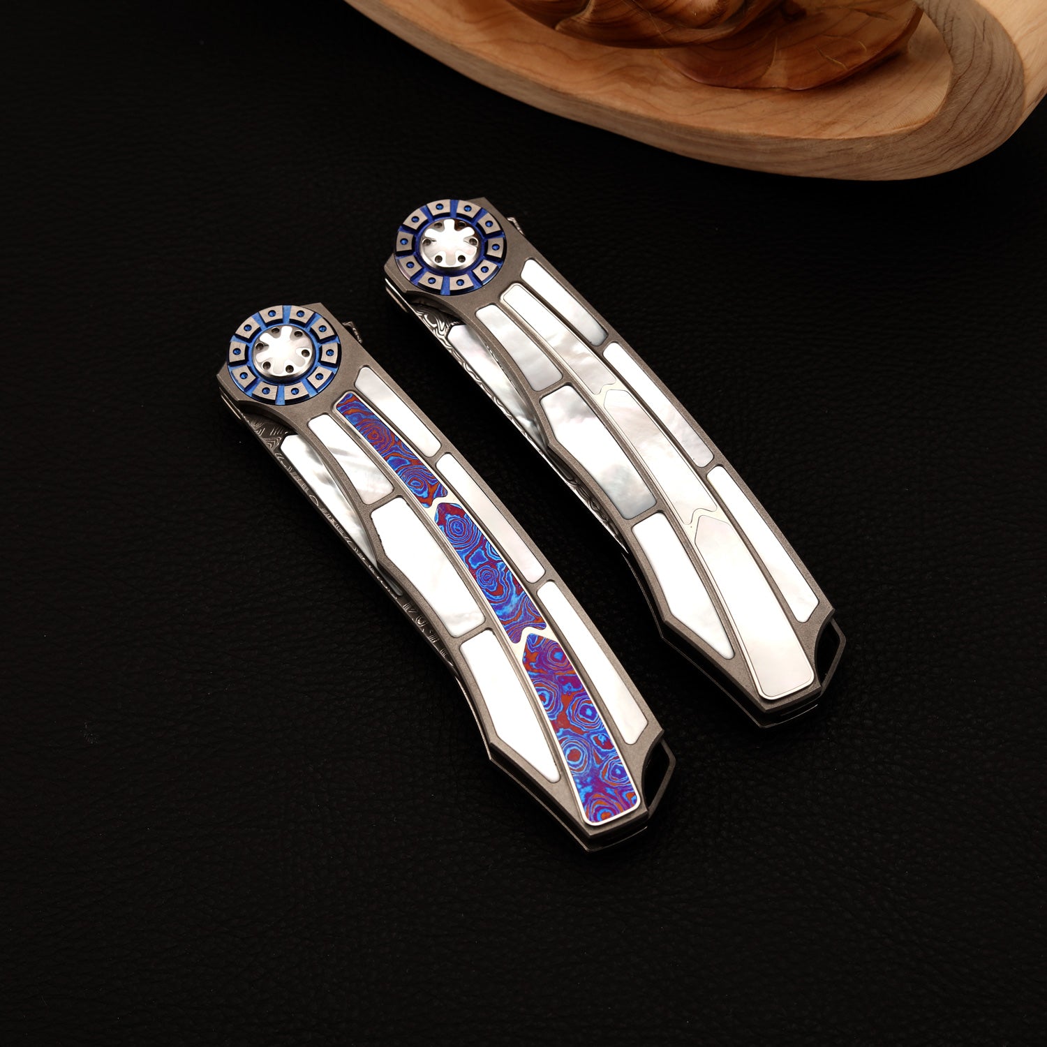 Handle Material: Mother of Pearl, Titanium, Timascus